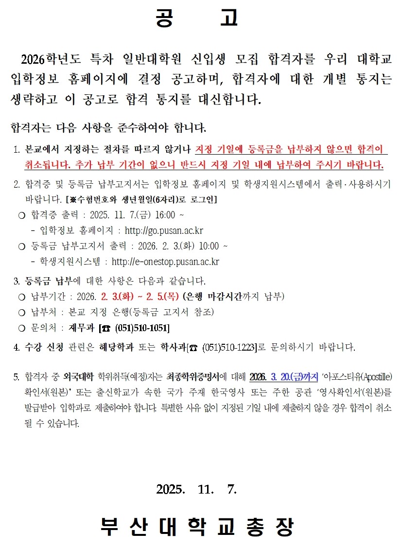 [입학]2026학년도 특차 일반대학원 신입생 모집 합격자 공고문