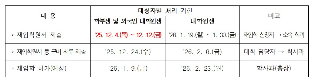 「2026학년도 제1학기 재입학 시행계획」을 붙임과 같이 안내드리니 신청을 원하는 학생은 기간내에 신청하시기 바랍니다.