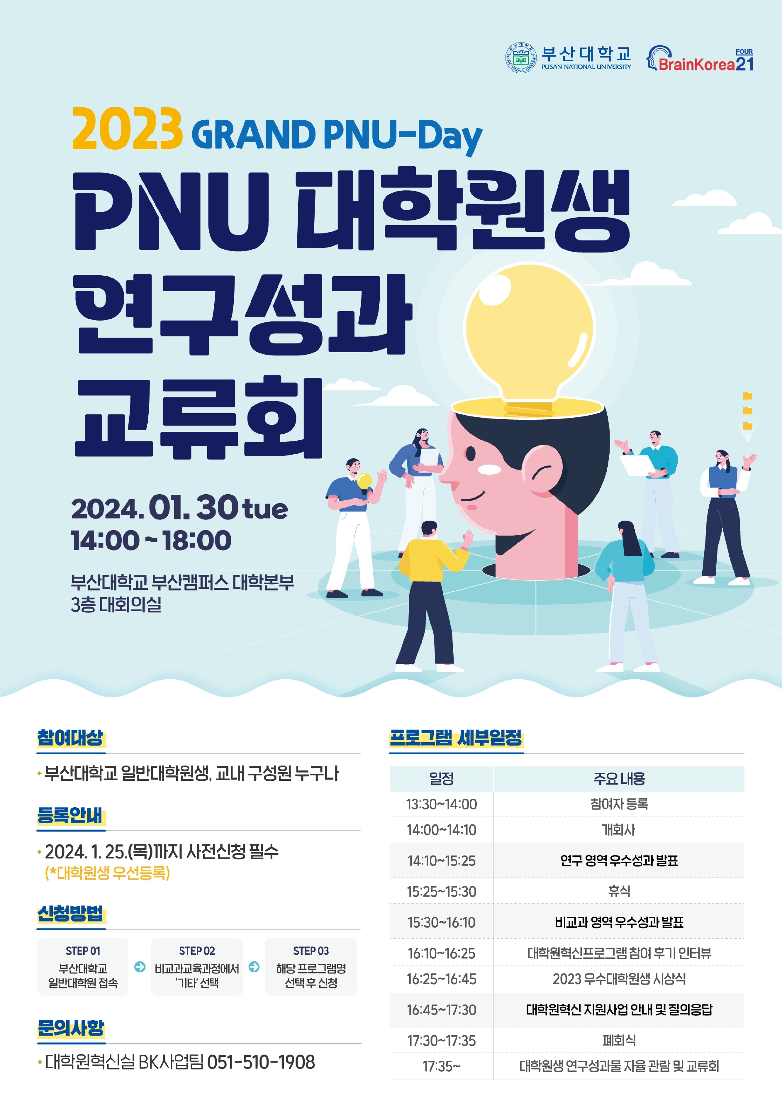 - (신청방법) 일반대학원 홈페이지-비교과교육과정-기타-「2023 PNU 대학원생 연구성과 교류회」