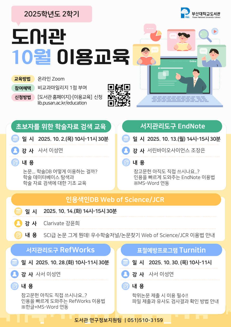 도서관에서 학부생 및 대학원생의 학술자원 활용능력 향상을 위해 실시하는 2025학년도 10월 도서관 이용교육 일정을 다음과 같이 안내합니다.
