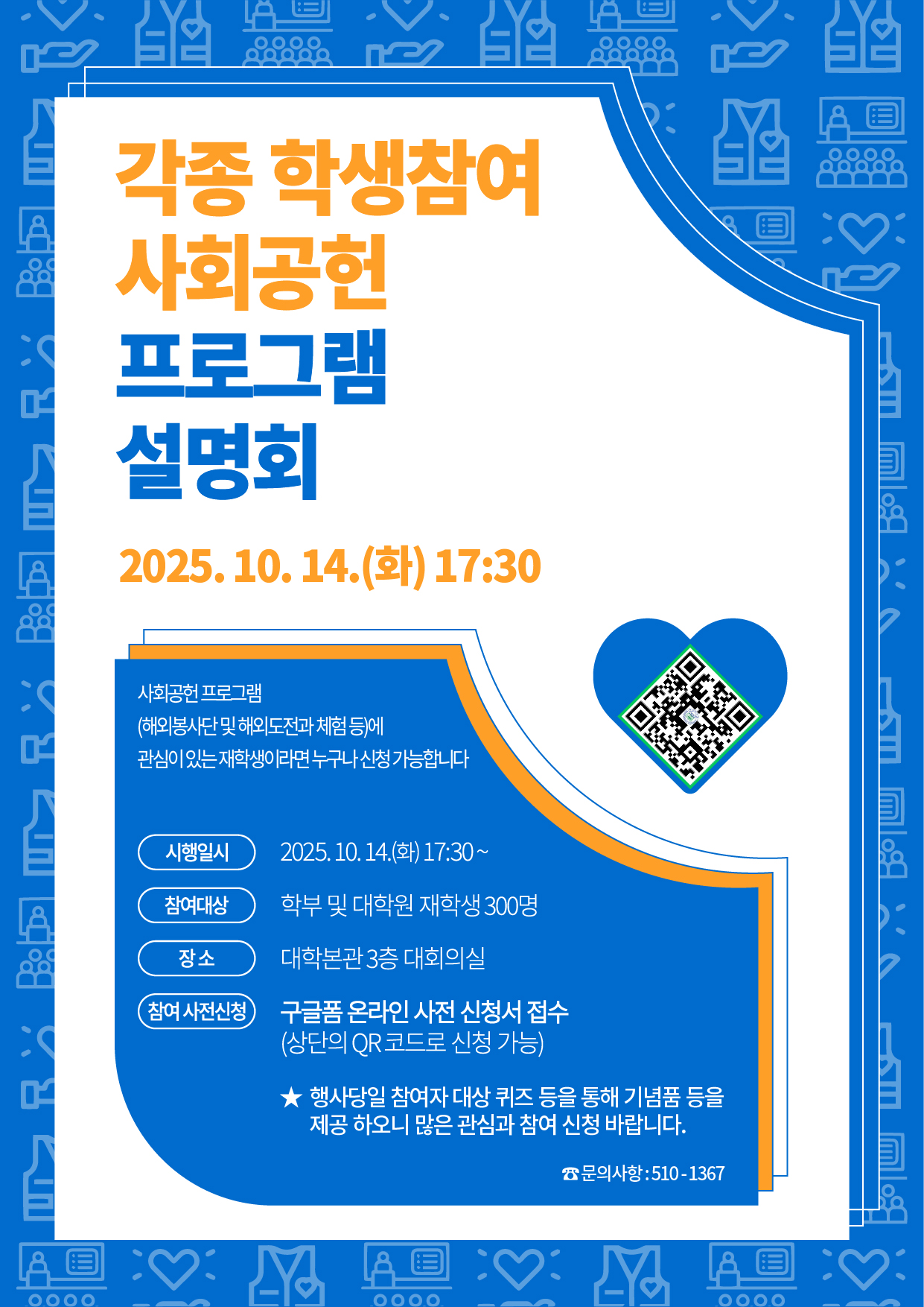 2025학년도 2학기 교내 재학생을 대상으로 각종 학생 참여 사회공헌 프로그램(해외봉사단, 해외도전과체험 및 대학생 멘토링 등) 설명회를 다음과 같이 시행하오니 학부 및 대학원 재학생들의 많은 참여 바랍니다.