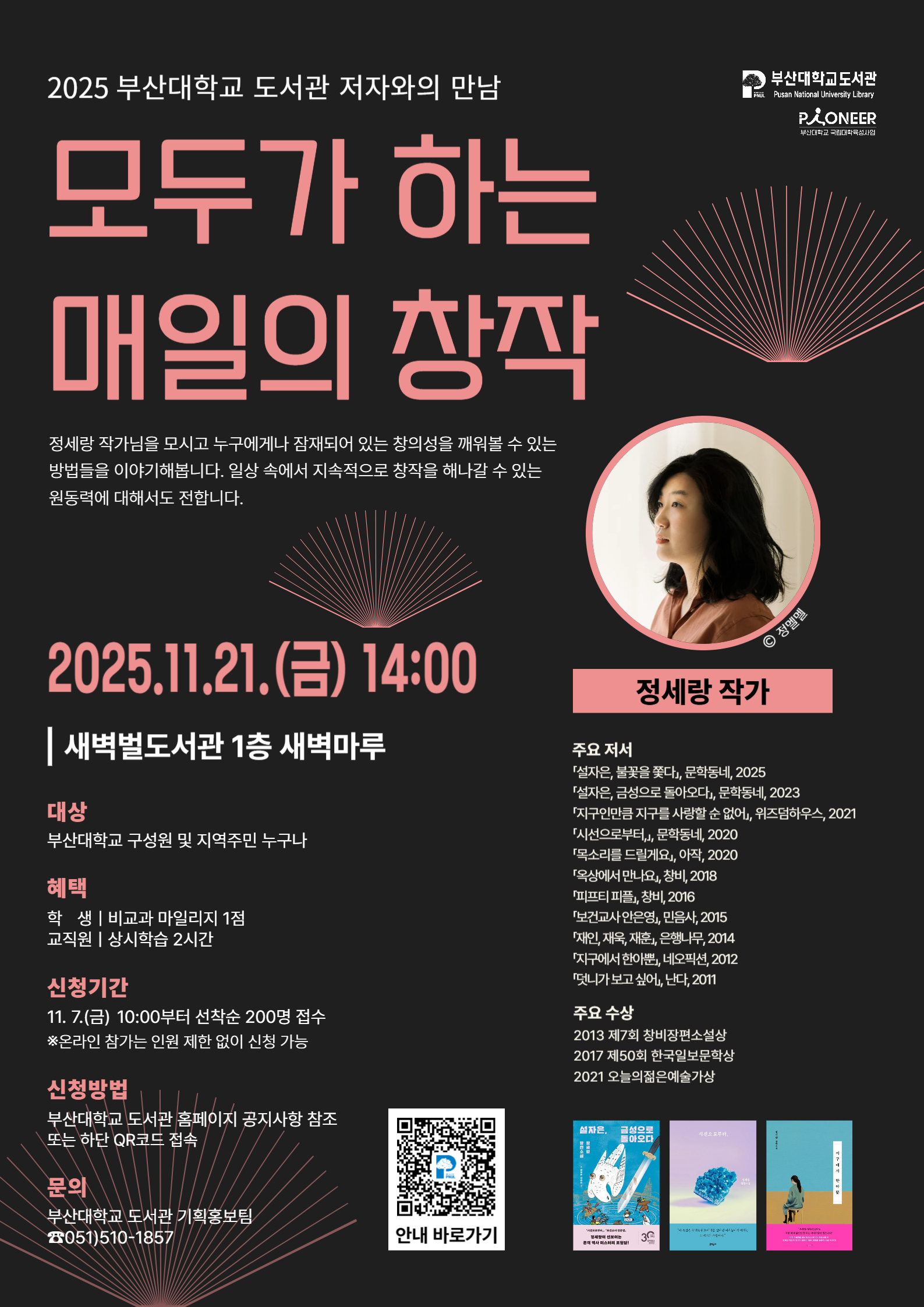도서관에서는 2025학년도 국립대학육성사업 책 읽는 대학의 일환으로 인문, 과학, 예술 등 다양한 분야의 명사를 초청하는 기획 강연회 <저자와의 만남>을 추진하고 있습니다.