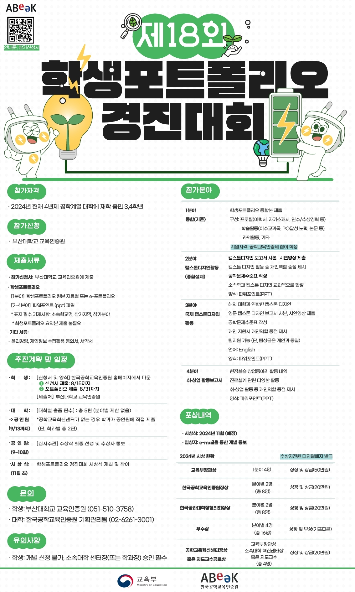 한국공학교육인증원에서는 공학교육 발전 및 사회가 필요로 하는 실력을 갖춘 공학기술인력 양성을 위해 전국 공학계열 3, 4학년 재학생들을 대상으로 제18회 학생포트폴리오경진대회를 개최합니다.