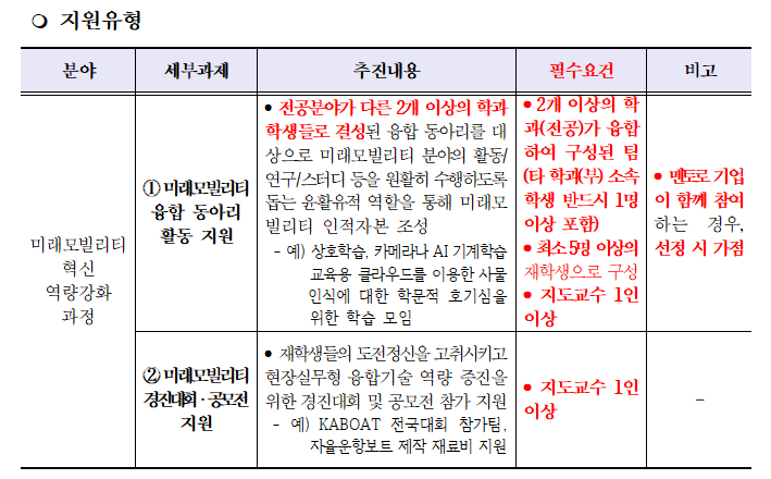 * 미래모빌리티 융합 동아리 활동 지원의 팀구성시 타 학과(부) 학생의 경우 참여학과(부) 재학생이 아니어도 지원 가능