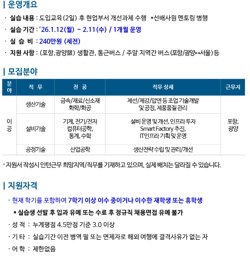 2025년 동계 포스코 현장실습(스틸브릿지) 학생 신청 안내