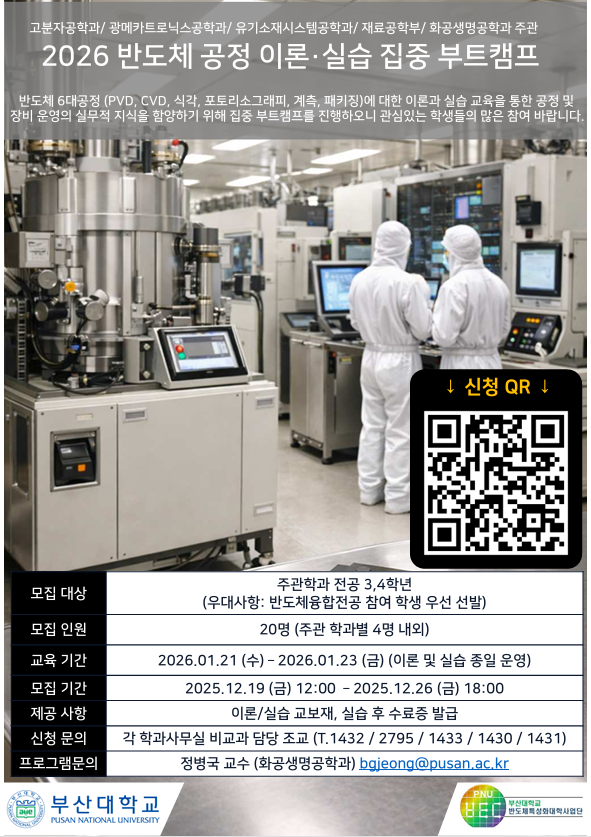 아래와 같이 반도체융합전공 참여학과 학생들을 대상으로 '2026 반도체 공정 이론·실습 집중 부트캠프'를 개최하오니, 관심있는 학생들의 많은 신청 바랍니다.