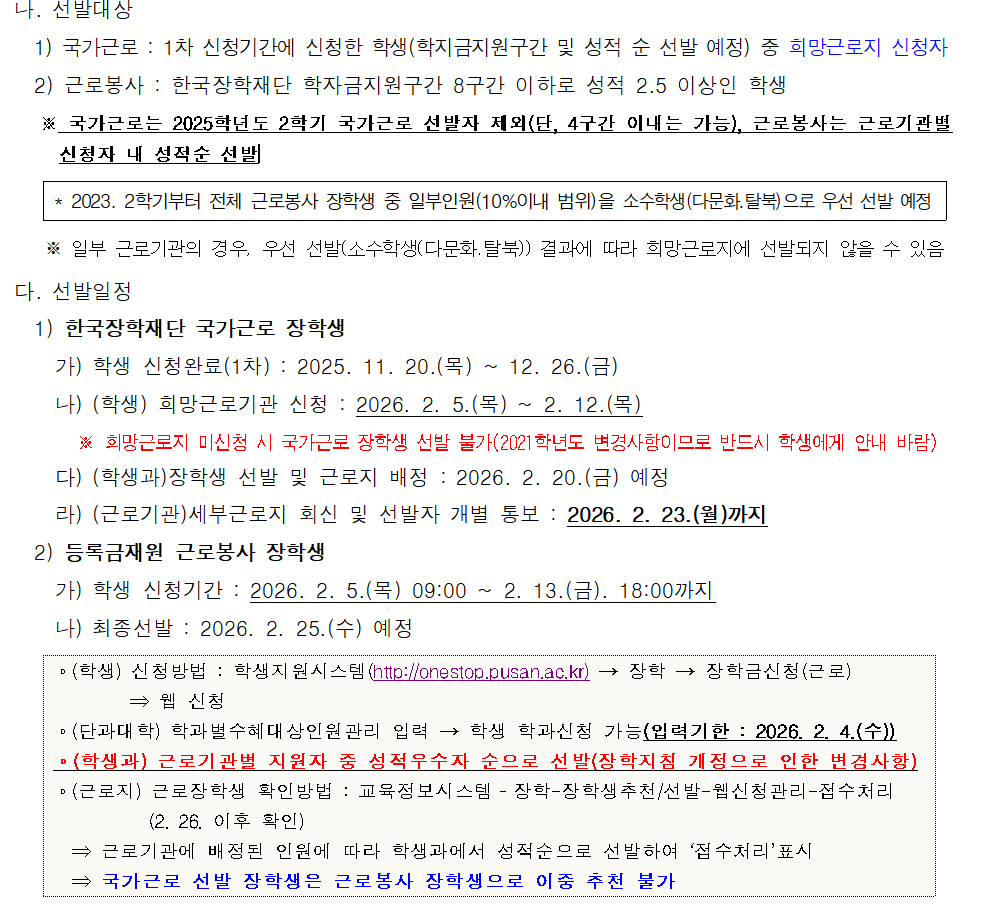 2026학년도 1학기 국가근로 및 등록금재원 근로봉사 장학생 신청 안내
