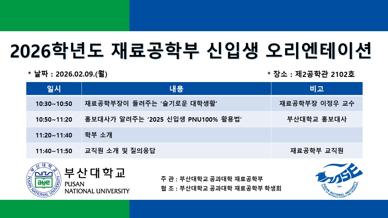 2026학년도 재료공학부 신입생 오리엔테이션 개최 안내(2/9, 10:30)