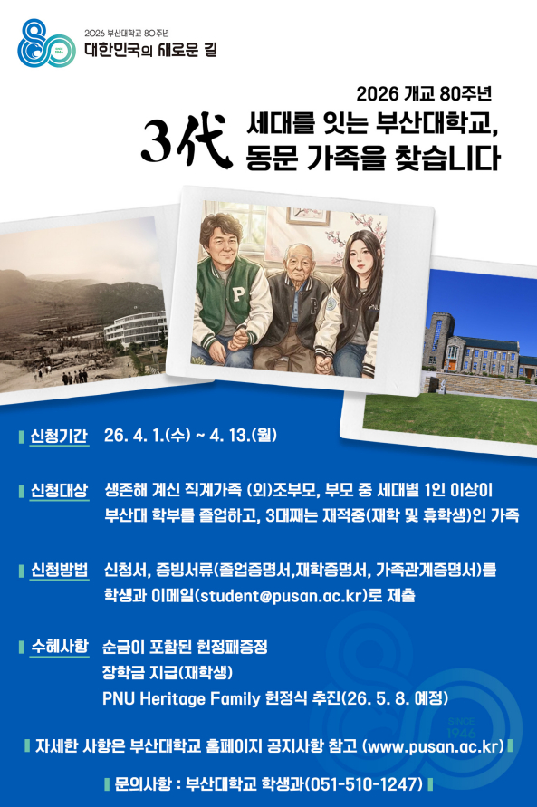 부산대학교 개교 80주년을 기념하고 역사를 되새기기 위해 '세대를 잇는 부산대 3代 동문 가족 찾기' 프로젝트 추진과 관련하여