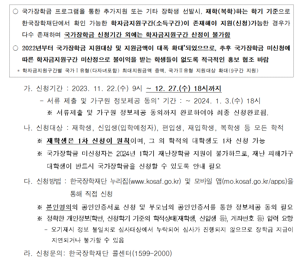 fnctId=bbs,fnctNo=8972 작성일 2023.11.23 수정일 2023.11.23 작성자 재료공학부 관리자 조회수 184 2024학년도 1학기 국가장학금 1차 신청 안내 첨부파일 (홈페이지)24년 1학기 국가장학금 1차 신청매뉴얼_f362b27a606f47659b0baf33a4c8e2e3-복사.pdf 미리보기 (모바일)24년 1학기 국가장학금 1차 신청매뉴얼_9593535fad9b45368ab87c69f4207481-복사.pdf 미리보기 말머리 분류 전체 공통 졸업 RSS 2.0 1384 건 게시물 검색 제목 작성자 게시글 리스트 학부공지 번호 제목 작성자 작성일 첨부파일 조회수 일반공지 [ 일반공지 ] 2026년 상반기 연구실안전(집합교육) 알림 조홍래 2026.04.16 3 일반공지 [ 일반공지 ] 2026년 1학기 기말고사 야간 잔류 신청 안내 [2025.05.25.(월) 10:00까지 조홍래 2026.03.30 0 일반공지 [ 일반공지 ] 부산대학교 재료공학부 중장기 발전계획(2026~2030) 재료공학부 관리자 2026.03.05 1 일반공지 [ 일반공지 ] 재료공학부 교직과정 폐지 안내 재료공학부 관리자 2025.03.24 0 일반공지 [ 일반공지 ] 공인영어성적 제출안내(상시) 재료공학부 관리자 2024.04.03 1 일반공지 [ 일반공지 ] 대학원 교과목 공동수강 허가서 재료공학부 관리자 2020.08.05 1 일반공지 [ 일반공지 ] 이수학점 확인 및 졸업사정 상담안내 재료공학부 관리자 2019.07.12 6 일반공지 [ 일반공지 ] [서식] 복수전공 / 부전공 재료공학부 관리자 2019.07.12 4 일반공지 [ 일반공지 ] [서식] 수업, 지도교수 관련 재료공학부 관리자 2019.07.12 4 일반공지 [ 일반공지 ] [서식] 휴학원 / 복학원 / 자퇴원 재료공학부 관리자 2019.07.12 3 일반공지 [ 일반공지 ] 정규학기 해외파견 지원대상자 유의사항 재료공학부 관리자 2019.07.08 1 일반공지 [ 일반공지 ] 조기취업 관련 학칙 개정 안내(2018.12.07. 수정) 재료공학부 관리자 2019.07.08 0 일반공지 [ 일반공지 ] 부산대학교 출석인정에 관한 세부지침(2024.1.8.수정) 재료공학부 관리자 2019.07.08 3 일반공지 [ 일반공지 ] ★ 재료공학부 졸업요건 ★ ---- (2021.03.11. 수정) 재료공학부 관리자 2019.07.08 3 일반공지 [ 일반공지 ] PASS 시스템 정기면담 신청 방법 안내 재료공학부 관리자 2019.07.08 1 일반공지 [ 일반공지 ] 2014년 9월 1일 이전 게시글 재료공학부 관리자 2019.07.08 0 1384 2026학년도 여름계절 운엥에 따른 복학 신청기간 알림 새글 재료공학부 관리자 2026.04.22 0 8 1383 [공통] 2026년 상반기 연구실안전(집합교육) 알림 새글 조홍래 2026.04.16 3 48 1382 [공학교육혁신센터]2026학년도 비교과 주요 프로그램 안내 재료공학부 관리자 2026.04.02 1 103 1381 2026학년도 1학기 지도교수 상담 실시 안내(~6/29) 재료공학부 관리자 2026.03.31 1 195 1380 [공통] 2026년 1학기 기말고사 야간 잔류 신청 안내 [2025.05.25.(월) 10:00까지 조홍래 2026.03.30 0 106 1379 [공통] 2026년 1학기 중간고사 야간 잔류 신청 안내 [2026.03.31.(화) 10:00까지 조홍래 2026.03.30 0 321 1378 2026년 사교육 영향평가 설문조사 안내 재료공학부 관리자 2026.03.24 0 203 1377 '세대를 잇는 부산대 3代 동문 가족 찾기' 프로젝트 추진 안내 재료공학부 관리자 2026.03.19 2 126 1376 2026학년도 유한재단 장학금 장학생 추천 관련(~3/13 14시까지) 재료공학부 관리자 2026.03.12 0 139 1375 [공통] 2026년도 실험복 수령 안내 [2026.03.10.(화)/11.(수) 13:10~15:0 조홍래 2026.03.09 0 171 1374 부산대학교 재료공학부 중장기 발전계획(2026~2030) 재료공학부 관리자 2026.03.05 1 339 1373 [공통] 2026년도 신구 연구활동 종사자 안전 교육 이수 요청 및 실험복 신청 안내 [2026.0 조홍래 2026.03.04 0 165 1372 [반도체소자개론] 증원관련 안내 재료공학부 관리자 2026.03.03 0 503 1371 2026학년도 사물함 배정 안내 재료공학부 관리자 2026.03.02 0 272 1370 [학사]2026학년도 1학기 추가 휴,복학 신청 기간 안내 재료공학부 관리자 2026.02.24 0 145 1369 2026학년도 1학기 수강신청 증원관련--설문링크포함 재료공학부 관리자 2026.02.13 0 1550 1368 2026학년도 재료공학부 신입생 오리엔테이션 개최 안내(2/9, 10:30) 재료공학부 관리자 2026.02.06 0 255 1367 2026학년도 기초졸업영어 수강생 모집 안내 재료공학부 관리자 2026.02.06 0 118 1366 [졸업] 2026년도 2월 재료공학부 학위수여식 개최 및 학위복 대여 안내 재료공학부 관리자 2026.02.04 0 620 1365 2026학년도 1학기 국가근로 및 등록금재원 근로봉사 장학생 신청 안내 재료공학부 관리자 2026.02.02 0 306 처음 1 2 3 4 5 6 7 8 9 10 다음 페이지 다음 끝 처음 다음 끝